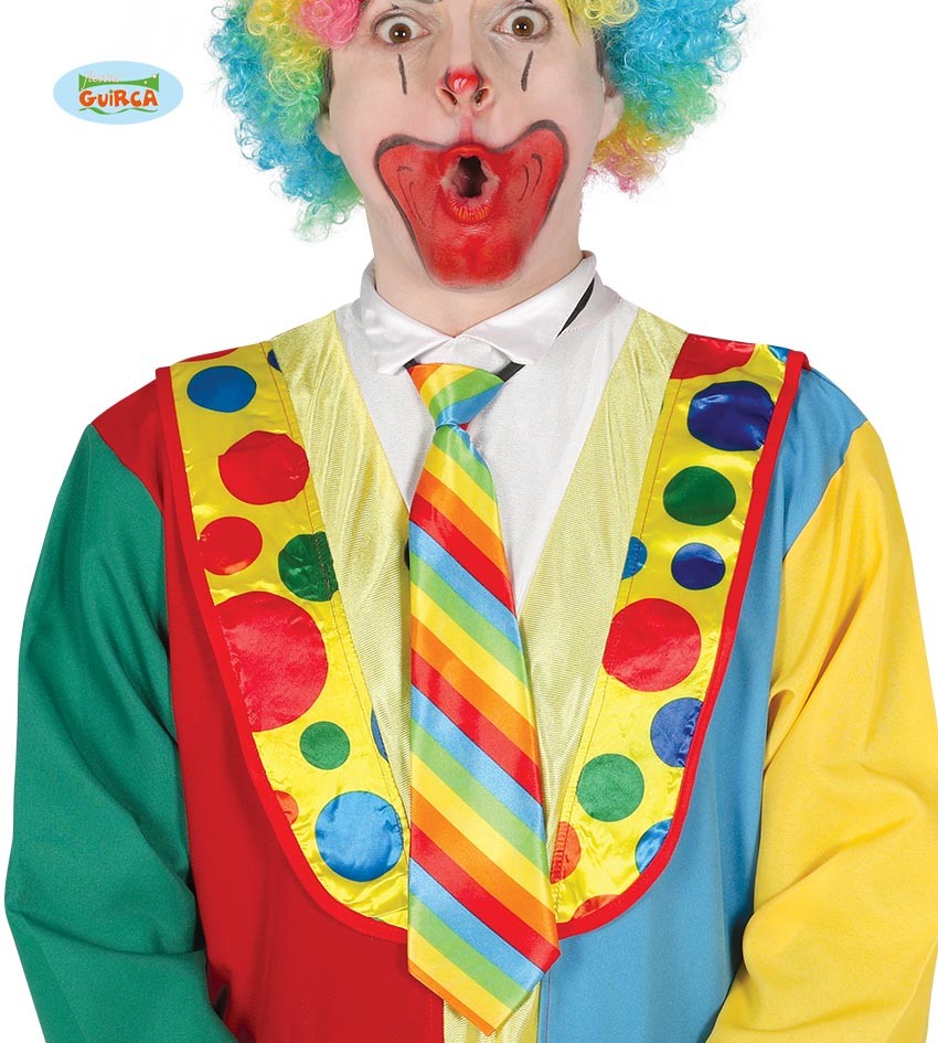 La cravatta multicolor da pagliaccio è un regalo perfetto per amici e familiari che amano divertirsi e travestirsi. È un accessorio originale e festoso che sarà sicuramente apprezzato e utilizzato in molte occasioni diverse.