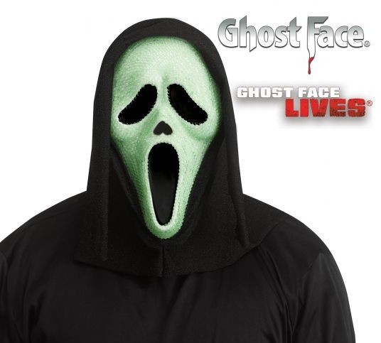 Questa variante preserva tutti i caratteri distintivi di Ghost Face: il volto allungato, occhi ossuti, bocca sfigurata, e spesso include un cappuccio “shroud” nero in tessuto che scende attorno al collo per dare continuità visiva. In versioni ufficiali, la maschera è realizzata in gomma o plastica rigida con uno strato fosforescente su fronte/volto che reagisce alla luce. Il cappuccio, in molte versioni, è integrato o collegato per evitare distacco durante l’uso.