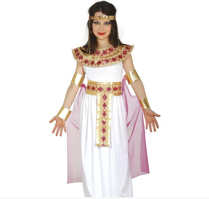 Il costume da principessa Cleopatra da bambina in colori sgargianti include: Cintura, Abito, Braccialetti e Mantello