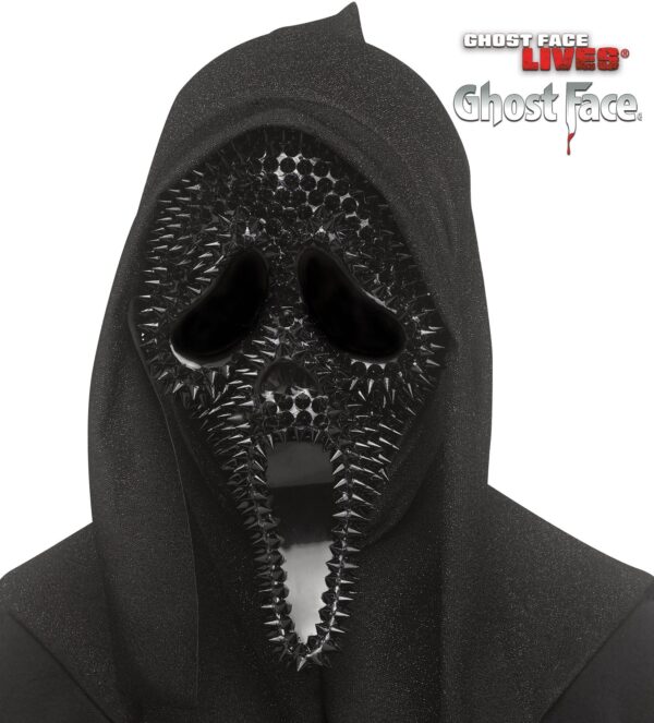 La maschera Ghostface borchiata nera con cappuccio brillantinato è una versione alternativa e spettacolare dell’iconico volto della saga Scream. Ufficiale e licenziata, combina il classico stile horror con dettagli dark fashion: superficie nera decorata da borchie lucide e cappuccio scintillante per un effetto scenico davvero unico.
